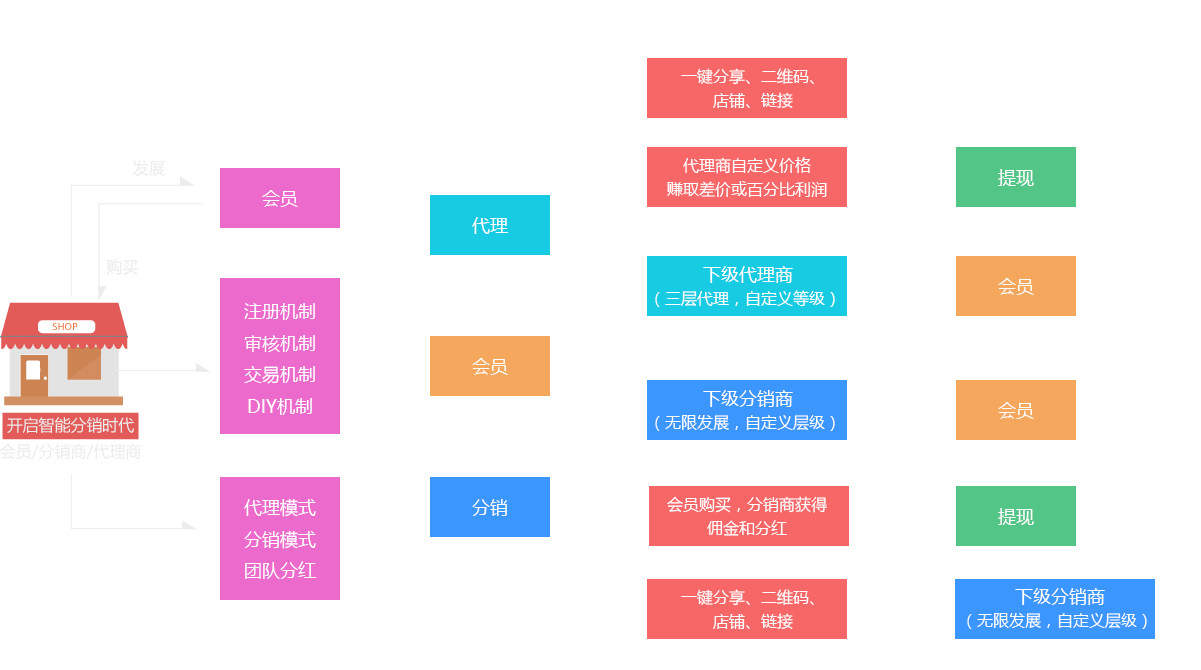 對于商家而言,代理商不僅是代理人,也可以是消費者,雙重身份,隨意切換,推廣產(chǎn)品的同時還能刺激消費,多渠道盈利。