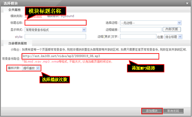 3、輸入“模塊名稱”、“背景音樂路徑”,設(shè)置“播放次數(shù)”后點(diǎn)擊“添加模塊