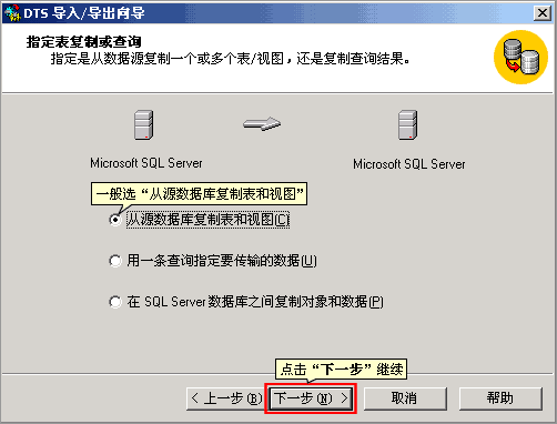 5. 選擇復制方式,一般選“從源數據庫復制表和視圖”,點“下一步”繼續