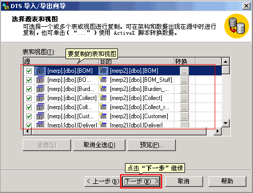 6. 選擇要復制的表和視圖,點“下一步”繼續