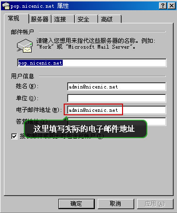 2:如果WEBMAIL收發正常,請檢查郵件軟件,比如OUTLOOK或者FOXMAIL設置,以下以OUTLOOK為例,按圖設置好用戶信息中的電子郵件地址為您的電子郵件地址,比如abc@nicenic.com,請設置為全稱.