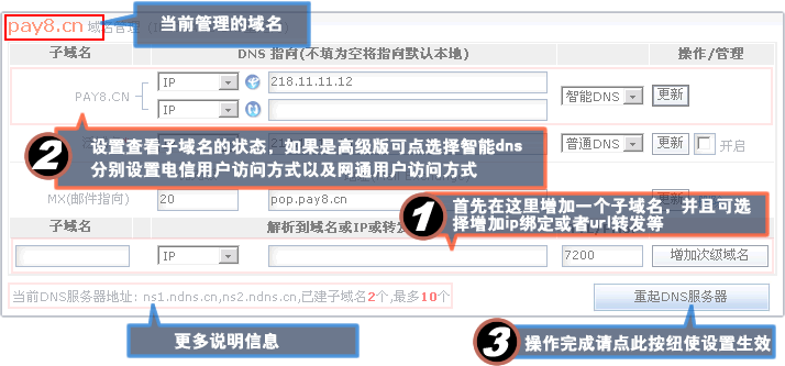 | 以下操作均以pay8.cn做為示例域名,請操作時結合自己的域名 域名申請成功后,默認有www.pay8.cn,pay8.cn兩個域名設置記錄,以及一個泛域名設置記錄。 1、如果要設置pay.cn/www.pay8.cn的解析,請在對應的文本框中輸入解析的ip地址,或者選擇cname以及轉發(fā)等分別設置 2、泛域名設置,要設置泛域名解析,請勾選泛域名記錄行后的“開啟”復選框即可設置泛域名功能 3、要設置其它的子域名,請在最下的文本框輸入子域名,并選擇解析或者轉發(fā)等,再設置好具體的地址后點“增加子域名”按扭既可增加成功,也可在增加成功后修改解析或者轉發(fā)地址。 4、高級版本的DNS管理系統(tǒng)具有智能DNS解析功能,增加子域名后,既可選擇智能DNS功能,此時同一個子域名就有“電信”和“網(wǎng)通”兩個不同的設置選項,您可以有針對的分別設置。 |